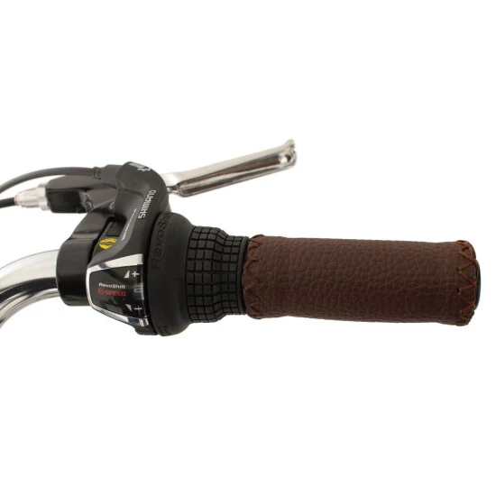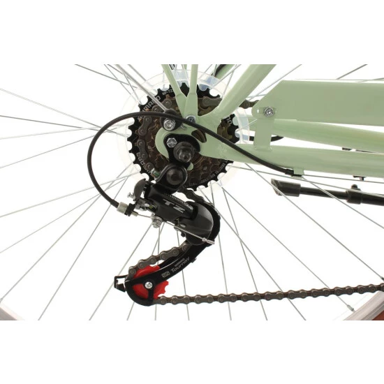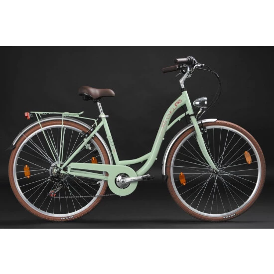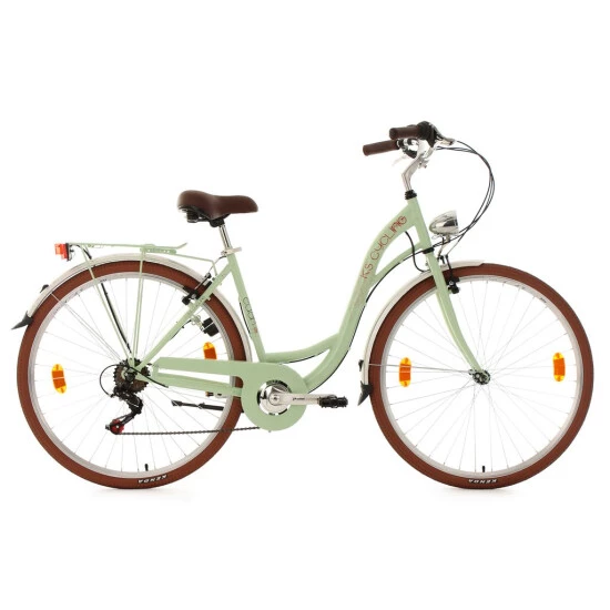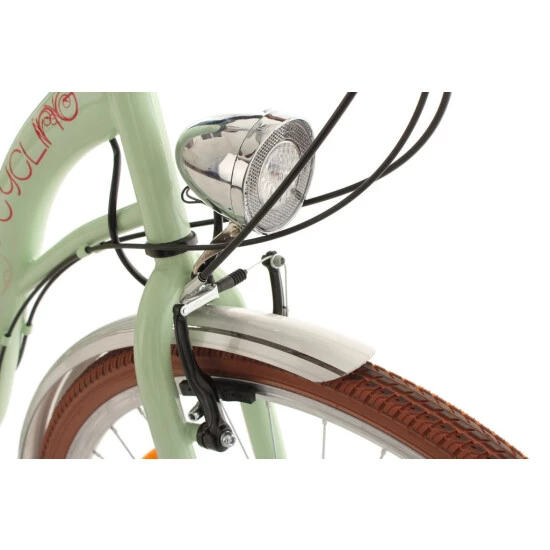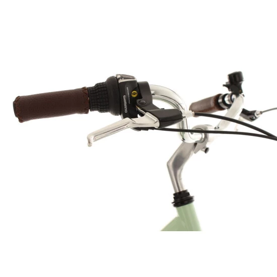 Der Rahmen erstrahlt in trendigem Mint. Reifen, Sattel und Lenkergriffe heben sich in einem eleganten Braun vom Rest des Damenfahrrads ab und verleihen ihm einen absolut edlen Look.