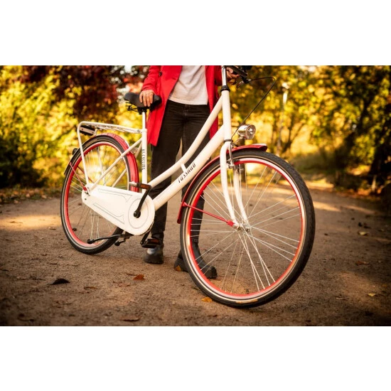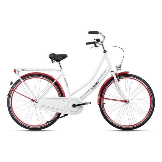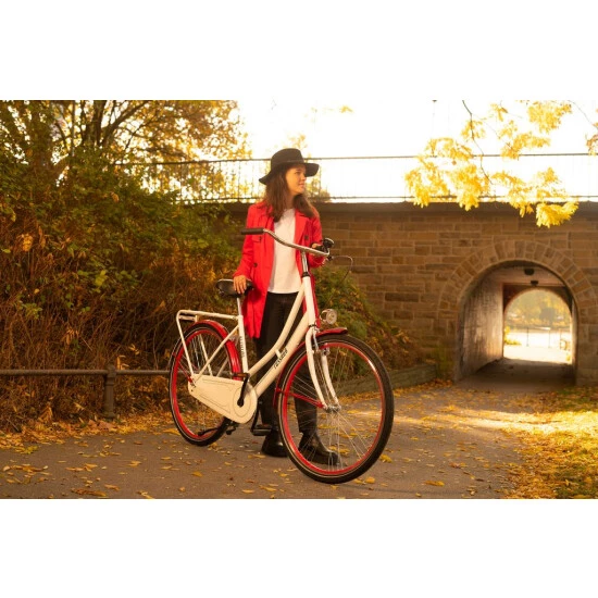Charakteristisch für das Hollandrad sind auch der Kettenkasten und der Zweibeinständer. Bequemer Citysattel, V-Brake vorne und Rücktrittbremse vollenden diesen zeitlosen Klassiker.