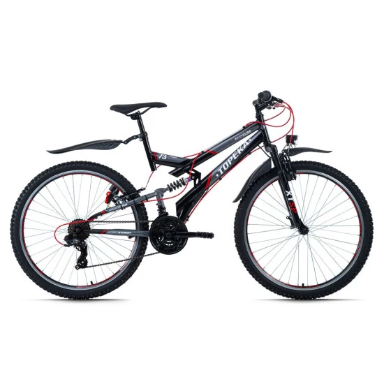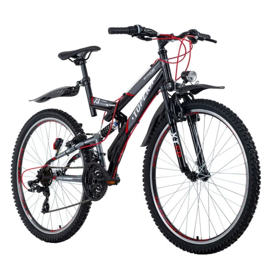 Der Star unter den Mountainbikes: Das 26″ Fully-MTB TOPEKA von KS Cycling ist mit roten und anthrazitfarbenen Details auf dem schwarzen Rahmen gestaltet. Das Bike ist ein absoluten Hingucker!