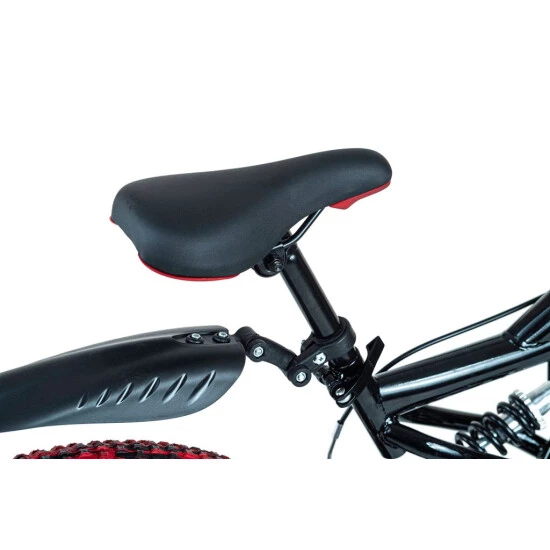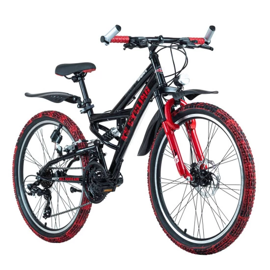 Einfach der Hammer, dieses Fully: Das vollgefederte 24″ Kinder-Fahrrad CRUSHER von KS Cycling überzeugt schon auf den ersten Blick durch seinen ausgefallenen Look. Die rote Federgabel und der schwarze, gefederte Rahmen bilden die Basis. Muddy-Red-Stollenreifen – jeder einzelne davon durch sein Handpainting ein absolutes Unikat – und die Decals mit „Destroyed“-Effekt machen das Kinderfahrrad zu einem richtigen Eyecatcher.