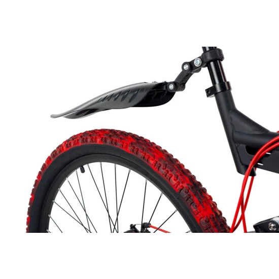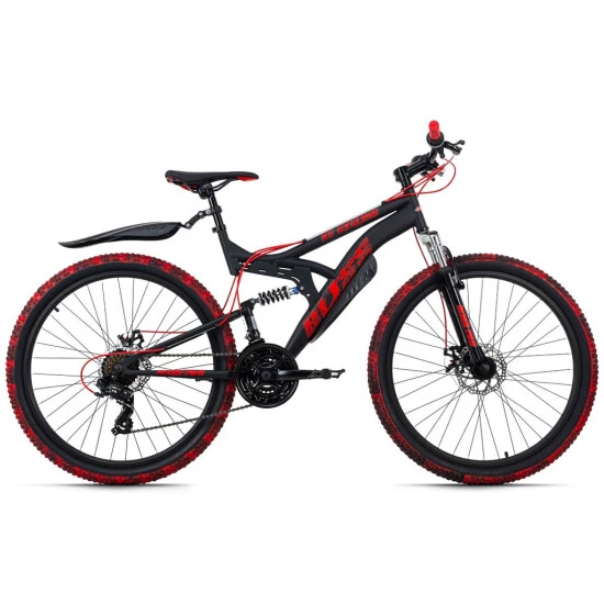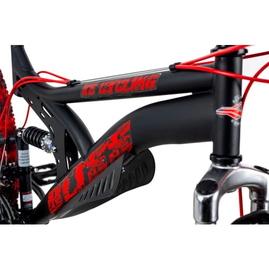 Stürzen Sie sich ins Abenteuer Mountainbiking: mit dem BLISS PRO von KS Cycling! Das vollgefederte 26″-Mountainbike kommt ganz in Schwarz mit Decals, Griffen und Kabelzügen in furiosem Rot. Auch Schutzbleche und Sattel sind aufs Design voll abgestimmt. Die Muddy Red-Stollenreifen können sich außerdem sehen lassen: das Painting wurde bei jedem Exemplar per Hand aufgetragen. So ist sichergestellt, dass es einen Reifen kein zweites Mal gibt. Jeder ist ein absolutes Unikat! Diese Hammer-Optik steht überall im Mittelpunkt!