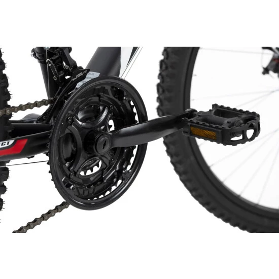 Das Bike ist mit einer 21-Gang-Kettenschaltung mit SHIMANO-Komponenten ausgestattet. Vorne und hinten sorgen mechanische Scheibenbremsen für die nötige Verzögerung. Der ergonomische Sattel fügt sich optimal ins Gesamtbild ein.