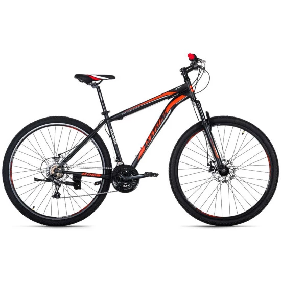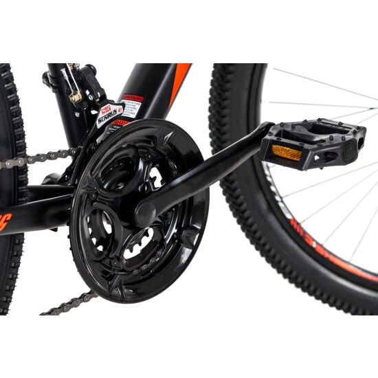 Das Bike ist mit einer 21-Gang-Kettenschaltung mit Drehschaltgriffen und SHIMANO Komponenten ausgestattet. Vorne und hinten sorgen mechanische Scheibenbremsen für die nötige Verzögerung.