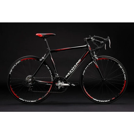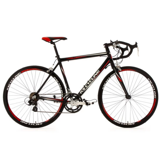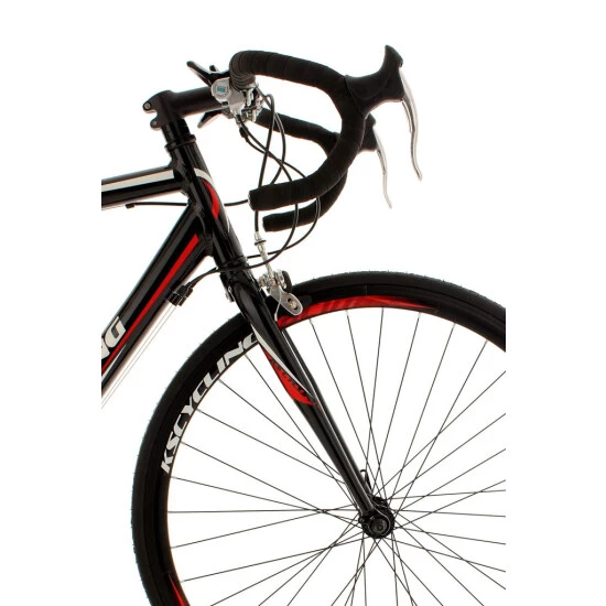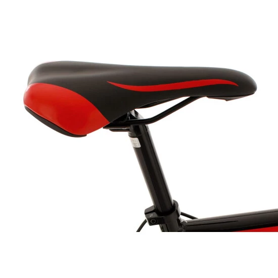 Das coole Design des Rennrads zieht alle Blicke auf sich: Das komplett schwarze Rad ist mit roten und weißen Details verziert, Sattel, Felgen und der schwarze Lenker fügen sich nahtlos in den Racing-Look ein.
