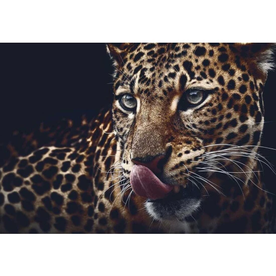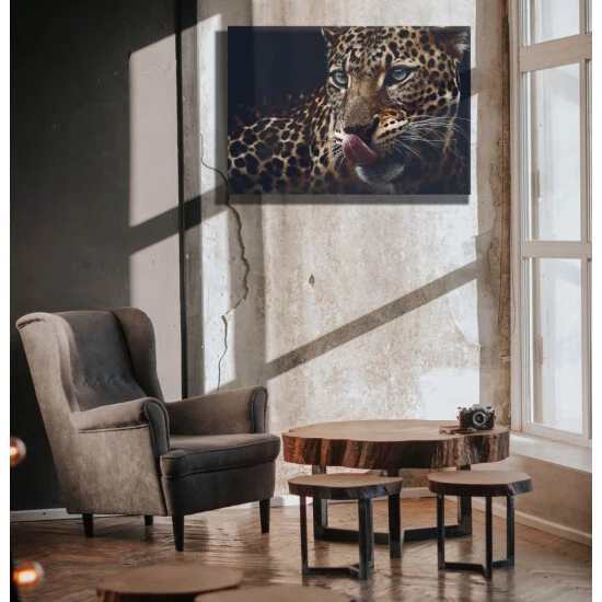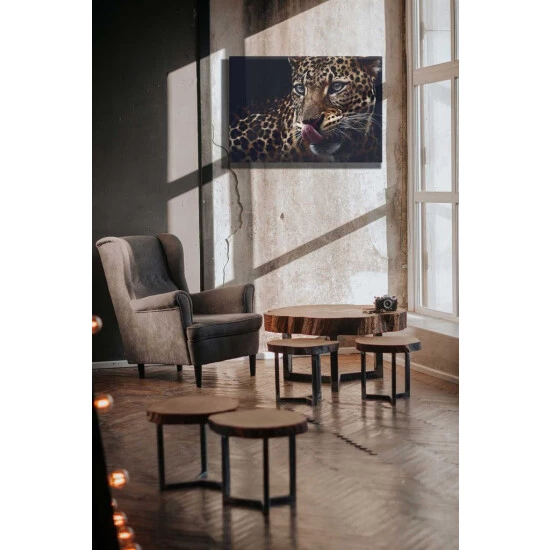 Dieses dekorative Wandbild ist als Deko-Panel ausgeführt und sorgt somit für eine freischwebende Optik. Das Motiv zeigt eine kraftvolle Fotoaufnahme eines Leoparden vor einem schlichten, schwarzen Hintergrund, der jeden Blick eindrucksvoll auf sich richtet. Der hochwertige Kunstdruck wurde hierzu auf eine solide MDF-Platte aufgezogen und rückseitig mit einem Rahmen aus Abstandsleisten versehen, die dem Bild seinen „Schwebeeffekt“ verleihen und für ein unkompliziertes Befestigen an der Wand sorgen. Das entsprechende Montagematerial ist allerdings nicht inklusive.