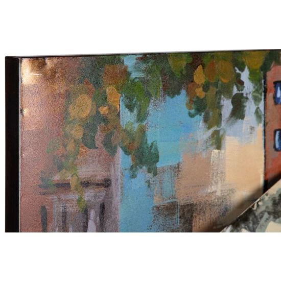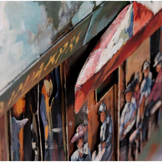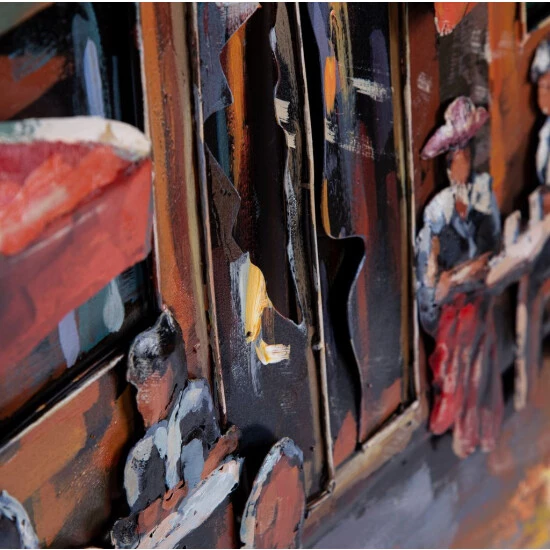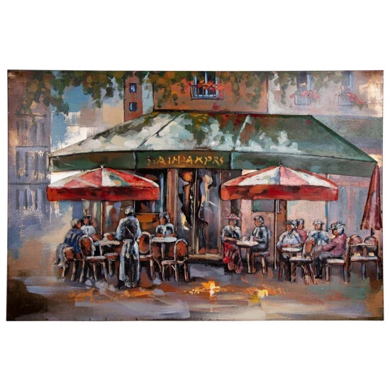 Dieses Metallbild wird durch viele handwerkliche Schritte zu einem individuellen Unikat gefertigt. Zu den einzelnen Schritten der Fertigstellung gehören unter anderem das Modellieren, Schleifen, Schweißen, Grundieren und Bemalen. Durch die zahlreichen aufgebrachten Details entsteht hier ein plastischer 3D-Effekt und eindrucksvoller Blickfang. Jedes Bild ist einmalig und stellt eine besondere Alternative zu herkömmlichen Wandbildern dar. Das Motiv zeigt ein Café in der Innenstadt welches gut besucht ist. Die Gäste sitzen unter Sonnenschirmen und genießen ihre Freizeit.
