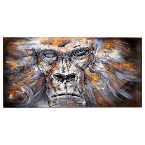 Dieses Metallbild wird durch viele handwerkliche Schritte zu einem individuellen Unikat gefertigt. Zu den einzelnen Schritten der Fertigstellung gehören unter anderem das Modellieren, Schleifen, Schweißen, Grundieren und Bemalen. Durch die zahlreichen aufgebrachten Details entsteht hier eindrucksvoller Blickfang. Jedes Bild ist einmalig und stellt eine besondere Alternative zu herkömmlichen Wandbildern dar. Das Motiv zeigt das Gesicht eines Gorillas bei dem die Augen- und Nasenpartie besonders plastisch ausgearbeitet sind.