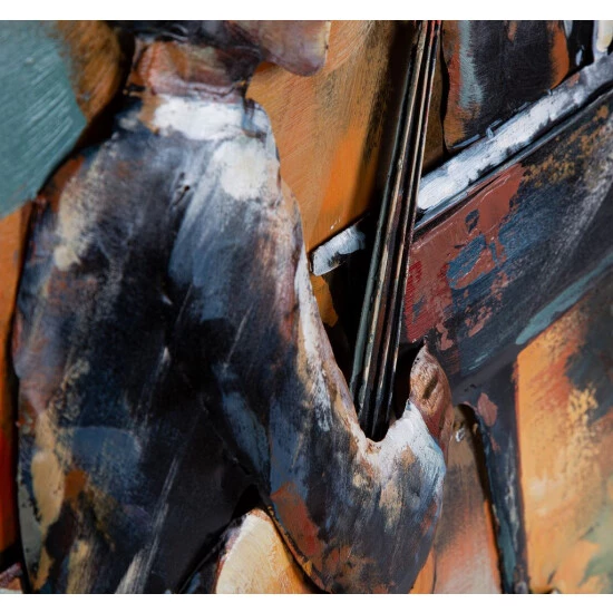 Dieses Metallbild wird durch viele handwerkliche Schritte zu einem individuellen Unikat gefertigt. Zu den einzelnen Schritten der Fertigstellung gehören unter anderem das Modellieren, Schleifen, Schweißen, Grundieren und Bemalen. Durch die zahlreichen aufgebrachten Details entsteht hier ein plastischer 3D-Effekt und eindrucksvoller Blickfang. Jedes Bild ist einmalig und stellt eine besondere Alternative zu herkömmlichen Wandbildern dar. Das Motiv zeigt eine Band die aus drei Musikern besteht. Die Momentaufnahme vermittelt den Eindruck als würde es sich um einen kleinen exklusiven Auftritt handeln bei dem Klavier und Streichinstrumente gespielt werden.