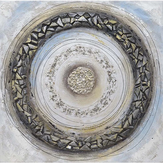Dieses außergewöhnliche Wandbild wird zum absoluten Hingucker in jedem Raum. Das handgemalte Bild bildet mehrere Kreise aus unterschiedlichen Texturen: Die kleinen Steine und größeren Bruchstücke wurden ringförmig arrangiert, sodass ein einzigartiges Kunstwerk entstanden ist. Auch die Farbgebung setzt gezielt Akzente und hebt die einzelnen Elemente optisch hervor. Jedes Bild wird von individueller Künstlerhand erschaffen, sodass ein in Nuancen einzigartiges Unikat entsteht. Das handgemalte Bild wurde mit wasserbasierten Lacken auf Leinwand gebracht und anschließend auf einen stabilen Holzrahmen gespannt. An der Rückseite befindet sich am Rahmen eine Halterung, an der das Wandbild leicht aufgehängt und gerade ausgerichtet werden kann.