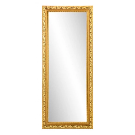 Dieser stilvoll gearbeitete Spiegel wird einen Hauch von Vintage in Ihr Zuhause bringen. Besonders schön ist der filigrane Rahmen mit dem Blattmuster und weiteren detailreichen Verzierungen, die diesen Spiegel zu einem kunstvollen Hingucker an jeder Wand in Ihrem Wohnbereich machen. Dank seiner großzügigen Spiegelfläche bietet dieser Spiegel die Möglichkeit sich komplett darin betrachten zu können und lässt gleichzeitig den Raum selbst viel größer erscheinen. Ebenso kann der Spiegel aber auch als perfektes Dekorationselement fungieren und beispielsweise im Querformat über einer Couch oder Kommode platziert werden. Mit seinem rundum eleganten Design bereichert dieser Spiegel jegliche Inneneinrichtung, von modern bis glamourös. Produktdetails: Echtholzrahmen Farbe: Gold inkl. Aufhänger Aufhängung horizontal und vertikal…
