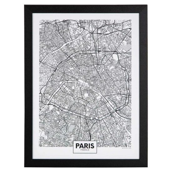 Diese Wanddekoration ist anhand des zeitlosen Schwarz-Weiß-Designs die perfekte Ergänzung für jeden Wohnbereich. Das abgebildete Straßennetz von Paris kommt auf dem hellen Hintergrund besonders gut zur Geltung und lenkt den Blick auf das Wesentliche. Gefertigt ist die Wanddekoration aus pflegeleichtem und stabilem Holzwerkstoff. Das Wandbild ist praktischerweise bereits gerahmt und kann dank der integrierten Aufhängung ganz unkompliziert an jeder gewünschten Wand angebracht werden. Produktdetails: Gerahmtes Bild hochwertiger Kunstdruck Rahmen schwarz Rahmenmaterial: Holz Motiv: Paris ca. Maße: Breite: 30cm Höhe: 40cm Lieferumfang: 1x Gerahmtes Bild Lorna – Motiv: Paris Eventuell abgebildete Dekorationsartikel, Beleuchtungen, HiFi-Geräte oder ähnliches sind nicht im Lieferumfang enthalten.